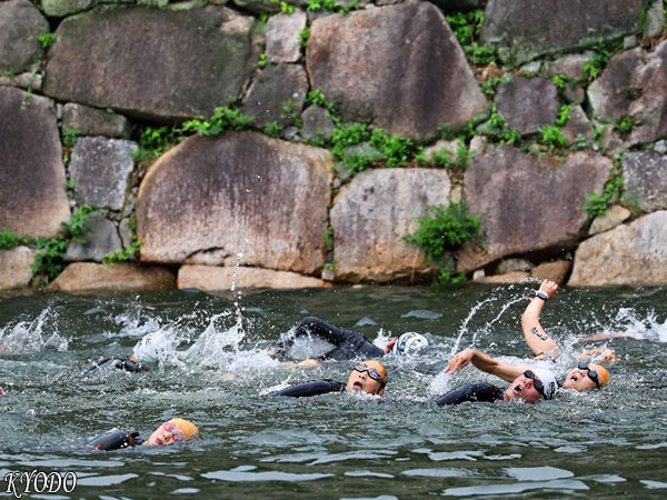 | 在大阪城東護城河展開游泳項目爭奪的參賽選手(6月25日,日本大阪) |