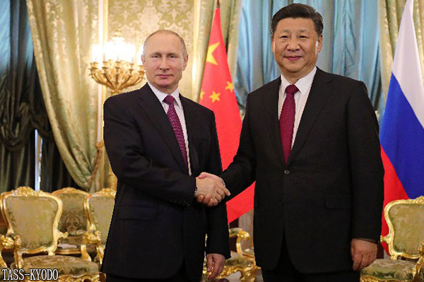 | 舉行會談的俄羅斯總統普丁(右)和中國國家主席習近平(7月4日,莫斯科,Tass-Kyodo) |