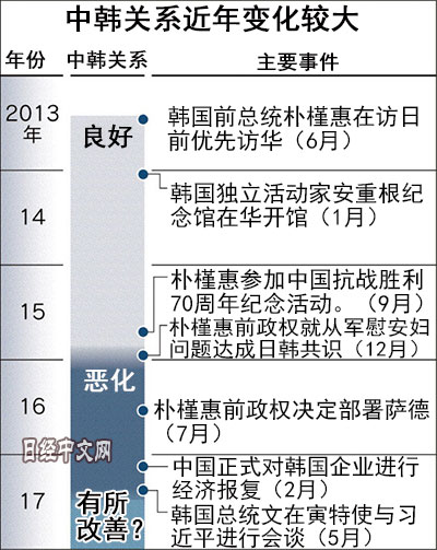對南韓來説,中國是最大的貿易對象國。中國佔南韓整體貿易額超過了20%,遠遠高於美國和日本。朴槿惠前政府將朝核問題當成最優先課題,在此期間,南韓迅速向中國靠攏,雙方構築了蜜月關係,但後來因薩德問題惡化。文在寅將美韓同盟作為安保政策的核心,但同時也顯示出了重視中國的姿態。