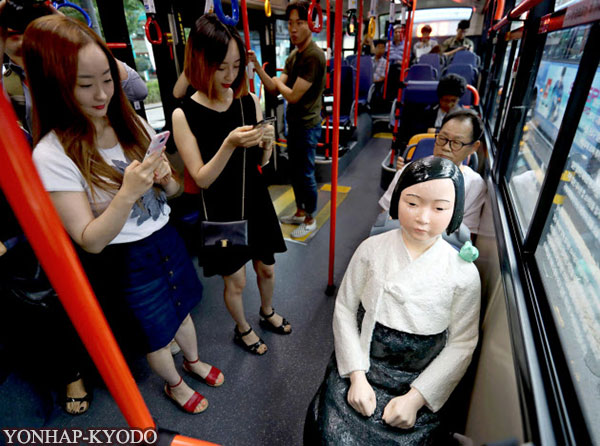 南韓首爾座位上設置了慰安婦少女像的公交車8月14日開始運作。該公交車行駛路線經過日本駐韓大使館附近,將運作至9月底。南韓南部的光州市當日也在公園等地設置了5座新的少女像。