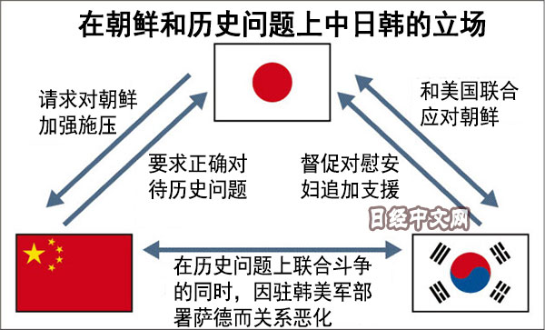 其背後存在日趨緊迫的朝鮮局勢。為了阻止朝鮮發射洲際彈道導彈(ICBM)等,日本重視與美韓兩國的合作。而中國承擔對朝鮮石油供給的大部分,在經濟方面的影響力巨大。日本政府不願與中韓兩國關係惡化。