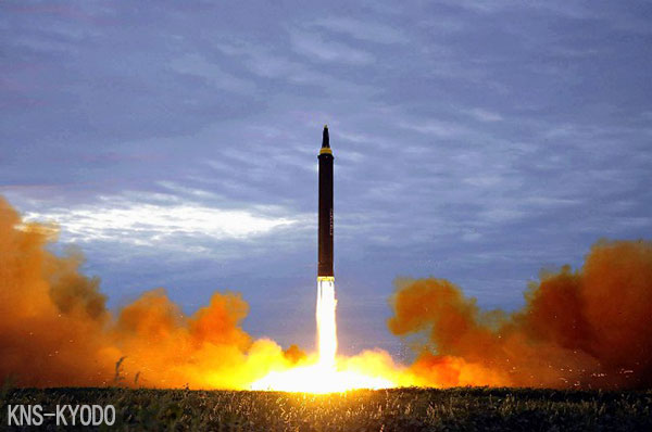 | 29日在平壤舉行的彈道導彈「火星12」發射訓練(KNS-KYODO) |