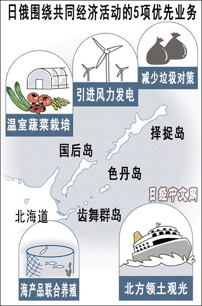 會談中選定了在北方四島(俄羅斯稱「南千島群島」)開展共同經濟活動的首批業務。為儘早實現海産品共同養殖、遊船觀光等5項業務而推進磋商。在如何建立一個不損害各自主權的「特別制度」方面,兩國的想法存在分歧。雖然為實現業務而設立了局長級作業部門會議,但具體實施尚無頭緒。