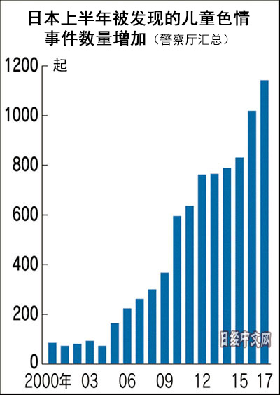 9月21日,日本經濟新聞(中文版:日經中文網)通過日本警察廳匯總的資料獲悉,2017年上半年日本全國警察揭露的兒童色情事件達到1142起,刷新最高紀錄。事件數量同比增加12.1%,連續13年增加。新確認受害的18歲以下兒童為594人,被騙通過郵件等發送自己裸照的「自拍」受害事件最多,超過40%。