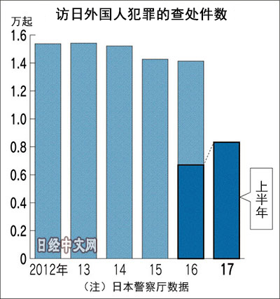 日本警察廳截至10月6日的統計(暫定值)顯示,全國警察2017年上半年(1~6月)查處的訪日外國人(不含永久居住者)犯罪案件達到8327起,同比增加23.1%。越南人扒竊等盜竊事件的余罪追究取得進展,推高了查處數量。查處人數增加8.0%,達到5193人。