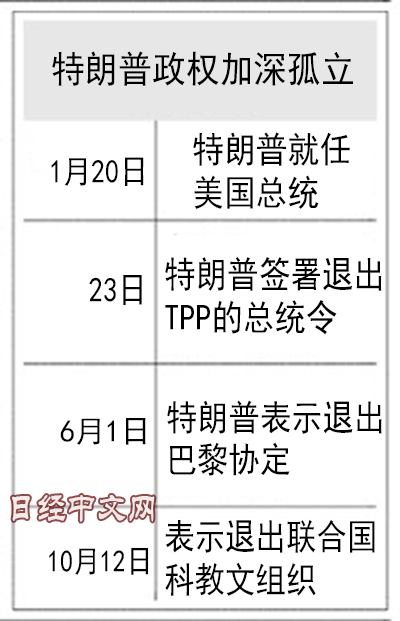 美國川普政權決定退出聯合國教科文組織(UNESCO),再次彰顯出為維護本國利益而不惜與國際社會發生衝突的姿態。包括宣佈退出跨太平洋夥伴關係協定(TPP)和應對氣候變暖的國際框架《巴黎協定》等,美國孤立路線給國際合作帶來巨大影響。