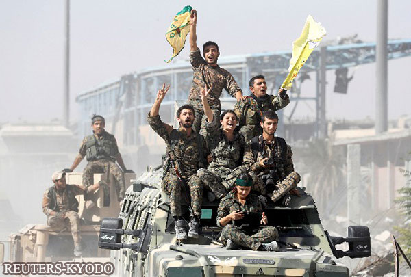 | 奪取拉卡後歡呼的敘利亞民主軍戰士(17日,reuters-kyodo) |