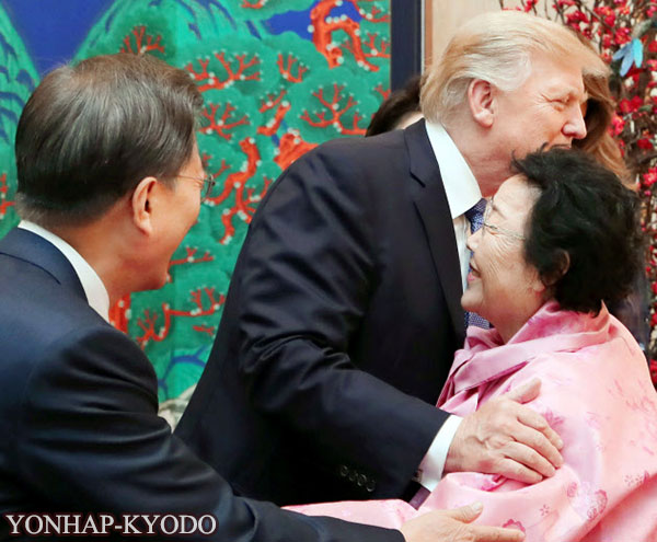 | 川普和李容洙擁抱。左為文在寅(7日,首爾,yonhap-kyodo) |