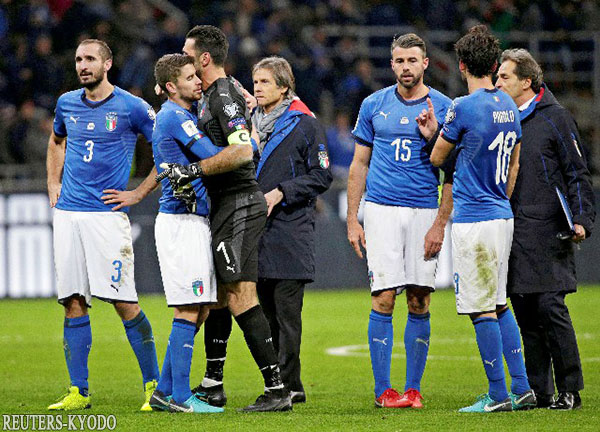 | 丟掉世界盃決賽入場券後沮喪的義大利隊球員(reuters-kyodo) |