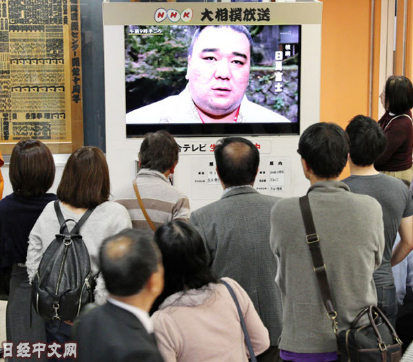 | 日本民眾圍在電視旁觀看日馬富士打人事件(11月14日,福岡市博多區) |