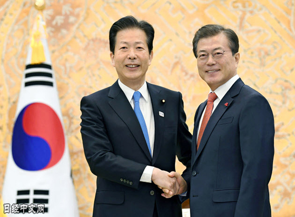 | 南韓總統文在寅(右)與公明黨代表山口那津男(左)握手(11月23日,首爾,Kyodo) |
