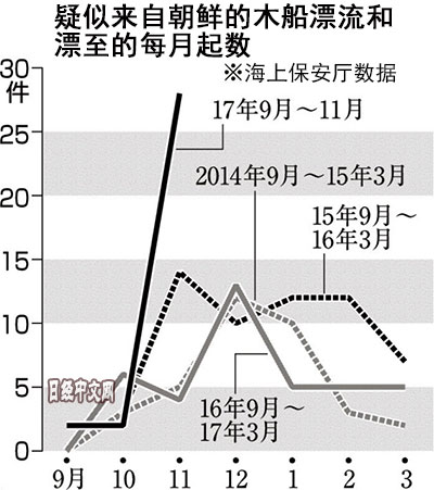 據海上保安廳統計,疑似來自朝鮮的木船的漂流和漂至在2013年為80起,2014~2016年徘徊在45~66起。2017年截至12月4日達到64起,從全年時間來看算不上特別多。但是,如果僅觀察11月,將達到過去4年中最多的28起。明顯多於2016年11月的4起、12月的13起。