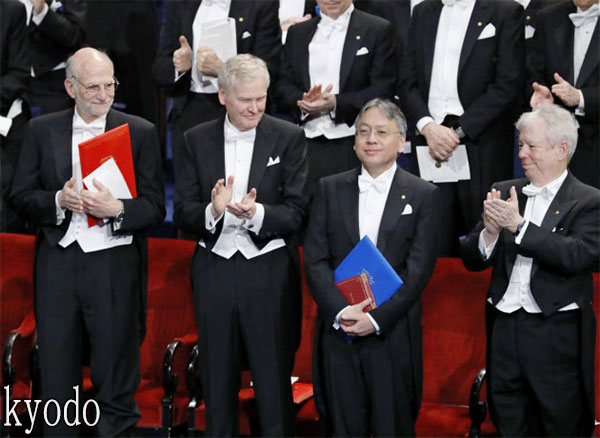 | 石黑一雄(右二)在頒獎典禮上(10日,斯德哥爾摩,kyodo) |