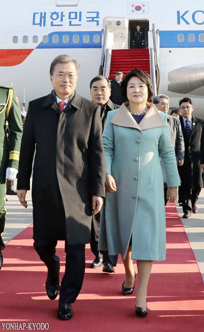 | 抵達北京機場的南韓總統文在寅(13日,yonhap-kyodo) |