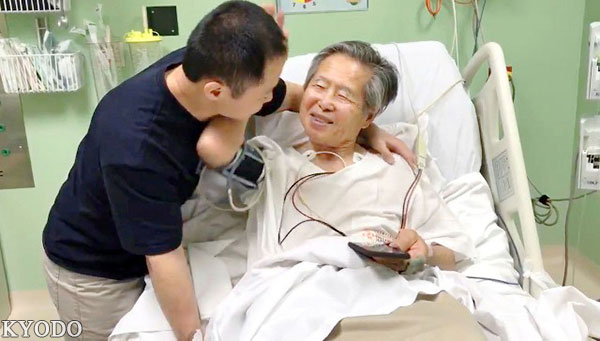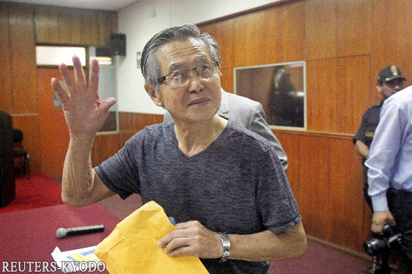 | 2015年1月8日,在當地法院向媒體揮手的秘魯前總統阿爾韋托·藤森(reuters-kyodo) |