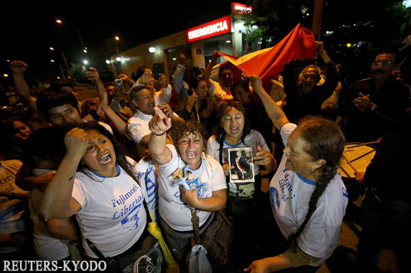| 24日晚,藤森派的支援者在藤森入駐的醫院門前集會(利馬,reuters-kyodo) |