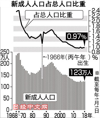 新成年人的數量自第2次嬰兒潮一代(生於1971~1974年)成年之後,自1995年起持續減少。2017年時隔2年出現增加,2018年與上年持平,但從中長期來看將保持減少態勢。