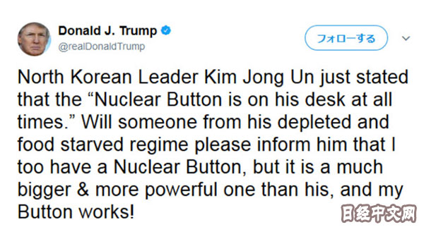 針對朝鮮勞動黨委員長金正恩「核按鈕一直放在我桌上」的言論,美國總統川普1月2日通過推特發文稱,「那個來自他(金正恩)貧窮和糧食短缺政權的誰,麻煩轉告一聲,我也有核按鈕,而且要比他的更大更強」。