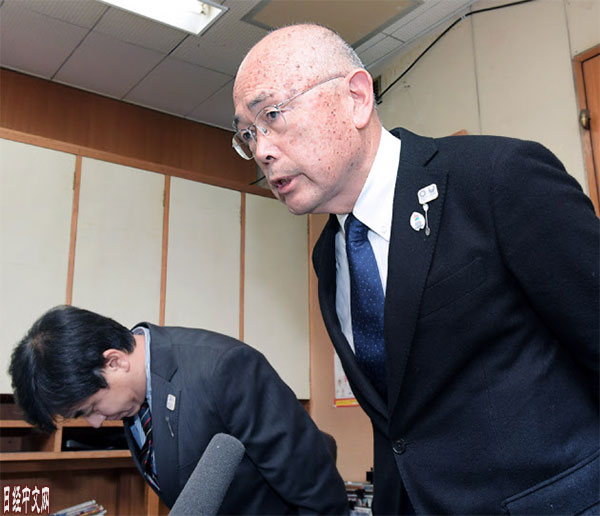 | 在記者會上低頭道歉的日本皮划艇聯盟會長成田(右)與(1月9日,東京都澀谷區) |