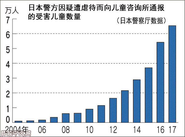日本兒童因受虐待而死亡的悲慘事件不斷發生。據日本警察廳統計,截至2017年的15年裏,共有1175名18歲以下兒童被虐待致死。此外,2017年日本全國警察因懷疑遭虐待而向兒童諮詢所通報的18歲以下兒童達到65431人,比上年增加20.7%,接近開始統計的2004年的70倍。據稱由於社會關注度提高,來自居民的報案正在增加。警察立案查處的案件數量達到1138起,創歷史最多。