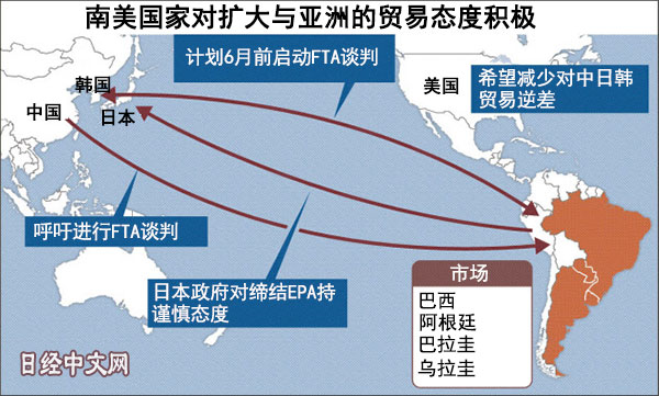 面向南美四國(巴西、阿根廷、巴拉圭、烏拉圭)組成的關稅同盟「南方共同市場(South American Common Market-- MERCOSUR)」,中韓兩國展開了旨在與之締結跨太平洋自由貿易協定(FTA)的行動。美國川普政權在貿易政策方面正加強本國優先的姿態,在此背景下,中韓則力爭開拓此前勢力薄弱的南美市場。一方面,南美也高度關注經濟持續增長的亞洲市場。雖然南美也顯示出與日本展開FTA談判的意向,不過日本仍保持著謹慎姿態。