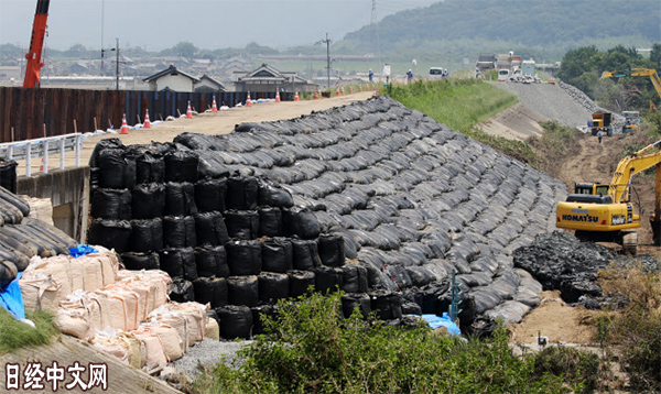 | 小田川的堤防正在進行恢復作業(7月17日,岡山縣倉敷市真備町地區) |