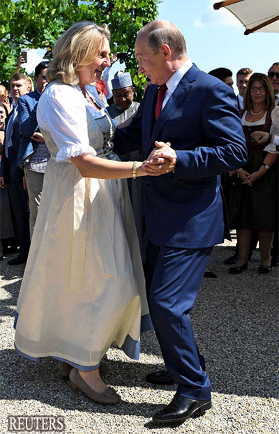 俄羅斯總統普丁當地時間8月18日在去德國與該國總理梅克爾會談途中,前往奧地利參加了女外長克奈斯爾的婚禮。普丁手捧花束現身作為婚禮場地的奧地利南部葡萄園,並與新娘共舞。有觀點認為,普丁政府希望以加強對俄友好姿態的奧地利為立足點,瓦解歐盟。