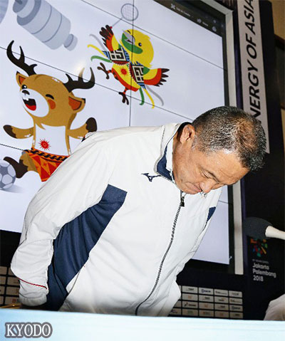 | 日本代表團團長山下泰裕在記者會上道歉(8月20日,雅加達,KYODO) |