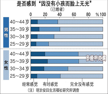 關於「是否因沒有孩子而臉上無光和受到困擾」的問題,回答「經常感覺」和「有時感覺」的已婚女性的比例在25~29歲為41.1%,30~34歲為51.7%。35~39歲為66.7%,40~4 4歲達到66.0%,大致為3人中就有2人有上述感受。