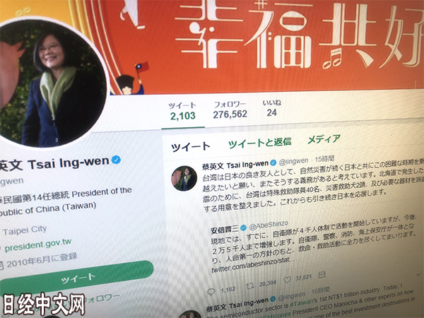 蔡英文9月6日在推特上用日語發推,對當日淩晨襲擊北海道的地震表示了慰問。她在推文中寫道:「我們希望與接連遭受自然災害的日本共同渡過這一困難的時期,我們也應盡這樣的義務」,她同時表示為支援北海道地震救災,台灣做好了派遣40名特殊救助隊員、災害救助犬以及提供必要的器材的準備。