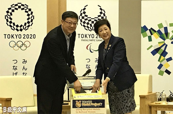 9月12日,東京都知事小池百合子在辦公室會見了北京市市長陳吉寧。日本為製作東京奧運會及殘奧會的金牌,正在從廢舊手機中提取貴金屬。陳吉寧帶來了不用的手機,並把手機放入回收箱裏。