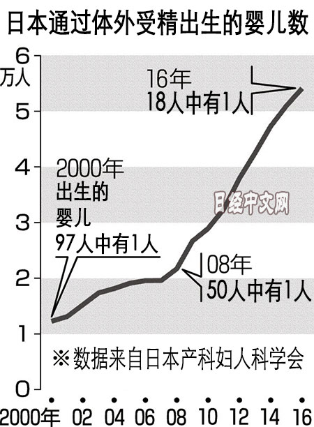 日本産科婦人科學會9月13日發佈調查結果,日本國內2016年通過體外受精出生的嬰兒的數量為5萬4110個。比2015年增加3109人,創歷史最多。日本厚生勞動省的統計顯示,2016年日本的出生總人數為97萬6978人,相當於18個嬰兒中有1個通過體外受精出生。