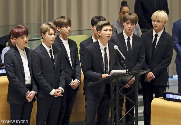 | 9月在聯合國總部活動中講話的防彈少年團成員(紐約,yonhap-kyodo,資料圖) |