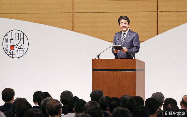 日本10月23日迎來年號改為「明治」(1868年)150年,日本政府在國會附近的憲政紀念館舉行了紀念儀式。擔任委員長的首相安倍晉三在致辭中強調:「為了迎接平成(1989年至今)之後的時代,將效倣明治時代(1868~1911年)的人,不畏懼任何困難,不斷開創未來」。安倍提出了採取少子老齡化對策等的想法。