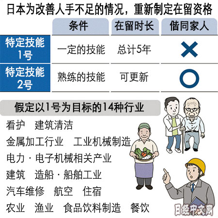 《入管法》修正案按設置了2個階段的新在留資格「特定技能」。對於具備「需要相當程度知識或經驗的技能」的外國人,將給予允許工作的「特定技能1號」。如果完成最長5年的技能實習、或通過技能和日語能力考試,將能獲得相應資格。在留期間總計為5年,不允許攜帶家屬。