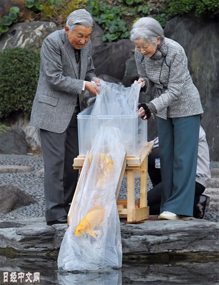 天皇夫婦當天放生了9條黃色和銀白色的長鰭錦鯉。看著它們用長長的魚鰭優雅地在水中游動,天皇感嘆道「這魚真漂亮啊」,皇后則表示「它們在親密地游動呢」。