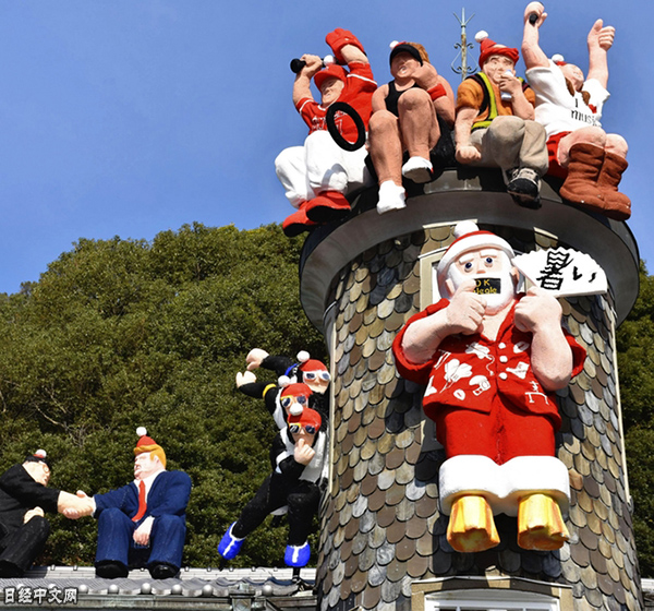 聖誕老人穿的襯衫上有美式橄欖球頭盔以及拳擊的手套圖案,代表今年這兩項運動出曝出的醜聞(在5月日本大學和關西學院大學的美式橄欖球比賽中,日大選手對關西學院大學選手實施惡意抱人截球;時任日本業餘拳擊聯盟會長山根明要求裁判做出偏向奈良縣選手的判定)。周圍的屋頂上排列著以運動員等為原型的人偶,包括活躍於美國職業棒球大聯盟的日本選手大谷翔平等。