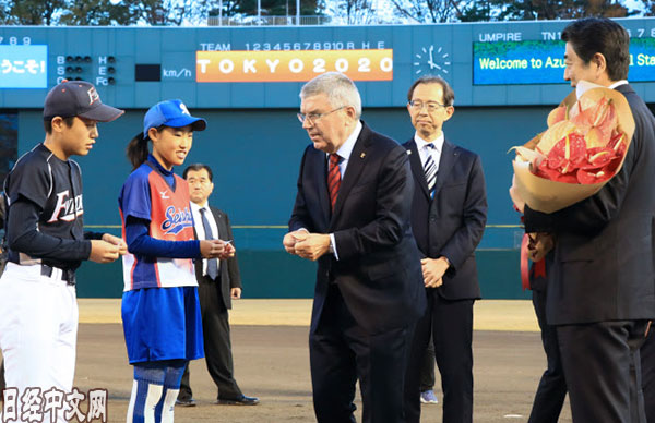 吾妻球場預定將舉行東京奧運會的壘球揭幕賽。安倍和巴赫在運動場受到當地中小學生的歡迎。在交換意見時,巴赫指出「體育在精神層面的重建上發揮了巨大作用」。安倍回應稱,「作為展現奧運力量的場所,福島縣非常適合」。