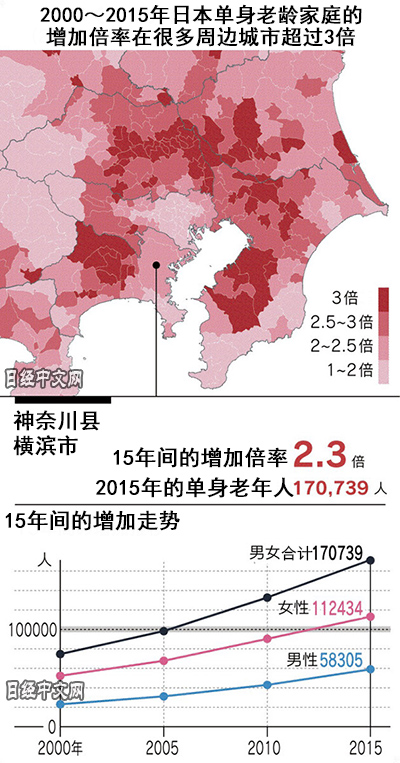 日本大城市裏獨自生活的老年人正在迅速增加。日本經濟新聞(中文版:日經中文網)分析人口普查數據發現,三大城市圈的1都2府5縣(指東京、神奈川、千葉、埼玉、愛知、大阪、京都、兵庫)在2000年以後的15年裏增至2.1倍,達到289萬人,2015年首次突破全部家庭的1成。單身老年人容易陷入需要護理和「生活保護」(日本的社會福利制度,針對達到一定貧困程度的人,保障其最低限度的生活)的狀態。日本社會保障的財政運營日趨嚴峻的風險加強,急需構建支撐以在家為核心的自立生活的「地區全面護理系統」。