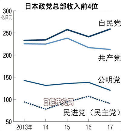 2017年眾議院選舉時發生分裂的民進黨的收入為90.4399億日元,比2016年減少15.3%。民進黨主張禁止收取企業和團體捐款,近9成收入來自政黨補助金,2017年政黨補助金減少了15.7%。該黨的支出額為125.4128億日元。在眾議院選舉之前成立的希望之黨的收入為20.6932億日元,立憲民主黨的收入為12.5040億日元。