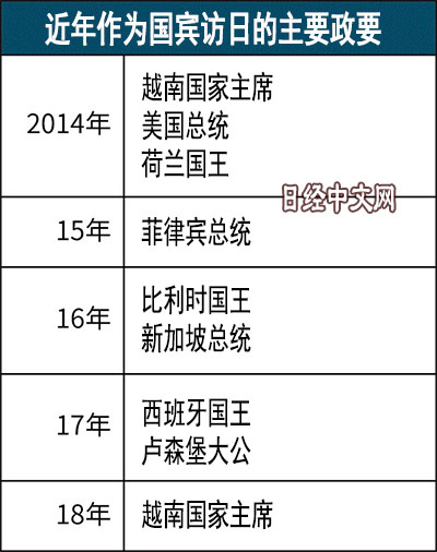 在日本政府內部,邀請美國總統川普在2019年5~6月2次訪日的方案浮出水面。除了6月底在大阪召開的二十國集團(G20)峰會之外,還計劃在此之前以國賓待遇接待川普。如果採取賓待遇,將帶來川普與5月1日剛剛即位的新天皇會見的機會。由於那時正值各國首腦相繼訪問日本的時期,如果政治意圖過於明顯,有可能出現在政治上利用天皇的擔憂。