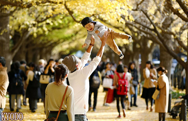 | 穿著薄衣漫步已變黃的銀杏行道樹下的人們(4日,東京神宮外苑,kyodo) |