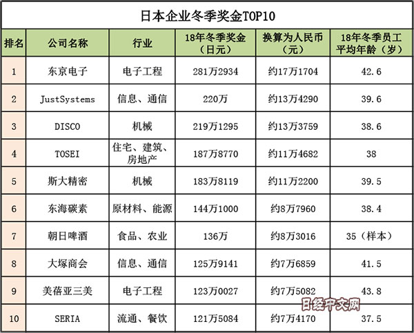 按企業來看,電子和機械等製造業企業排名靠前。排在首位的東京電子為281萬2934日元(約合人民幣17萬1704元),比上年增加30.33%。該公司根據業績決定發放額,2018年4~9月的合併營業利潤同比增長42%,創下歷史新高,因此獎金也大幅增加。