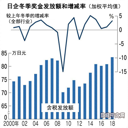 日本經濟新聞社(中文版:日經中文網)12月10日匯總的2018年冬季獎金調查(截至11月30日)顯示,全部産業的平均發放額為83萬4391日元(約合人民幣50932元)。在企業業績堅挺的背景下,冬季獎金創出1975年啟動調查以來的最高額,比上年增加3.28%,連續6年高於上年。不過,由於貿易戰等問題,世界經濟前景的隱憂正在加強,今後能否維持增長是未知數。