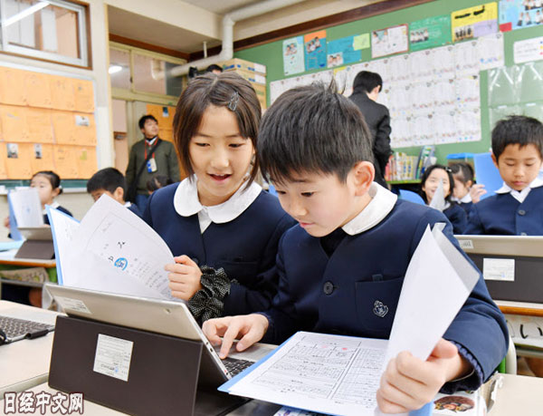 | 結業式後相互展示學期報道單等的小學2年級學生(25日上午,東京都港區的芝小學校) |