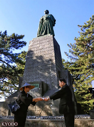 相關人士在坂本龍馬的塑像前舉行了信件轉交儀式。裝扮成1871年日本引入郵政制度時郵遞員形象的男性把158封賀年卡交給了高知縣立坂本龍馬紀念館的館長高松清之。