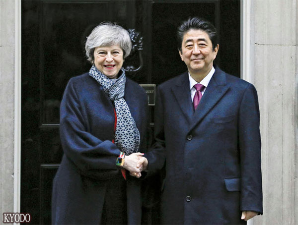 | 特蕾莎·梅(左)與安倍(右)(1月10日,倫敦,KYODO) |
