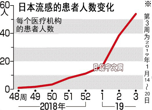 日本厚生勞動省1月25日宣佈,14~20日的1周裏報告的流感患者為平均每個醫療機構53.91人。人數僅次於創歷史最多的去年冬季頂峰時的54.33人。全日本到醫療機構就診過的流感患者約達213萬人(推算值),比上一週增加近50萬人。