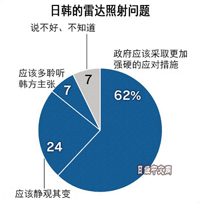 日本經濟新聞(中文版:日經中文網)1月25~27日實施的輿論調查顯示,關於日本政府在南韓海軍驅逐艦用火控雷達照射日本自衛隊巡邏機問題上的態度,回答「應該採取更加強硬的應對措施」的受訪者佔62%,比例最高。回答「應該多聆聽韓方主張」的受訪者僅佔7%,回答「應該靜觀其變」的佔24%。