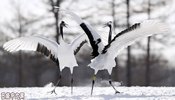 在皚皚雪地上,雌性和雄性的丹頂鶴或拍打翅膀,或上下晃動脖子,跳著「求愛舞蹈」,來自日本國內外的遊客邊發出歡呼聲邊按下快門。